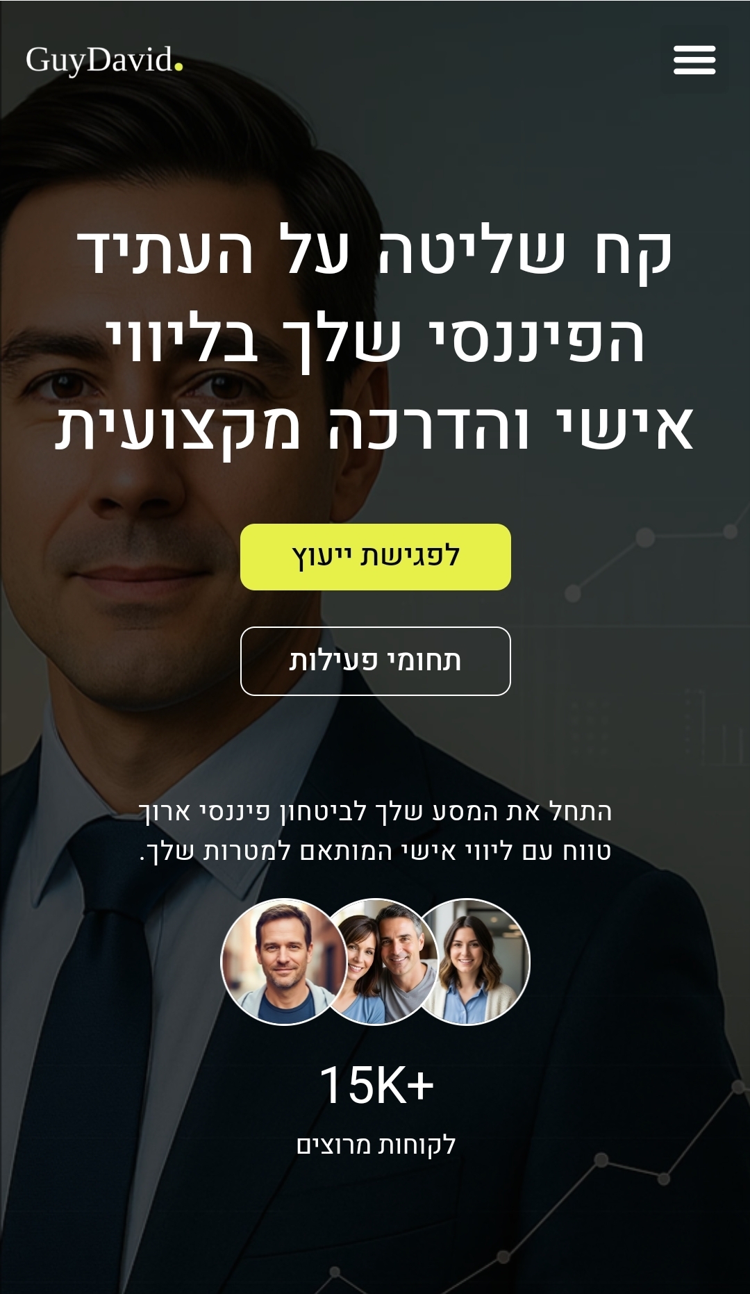 אתר עבור מתכנן פיננסי אישי גיא דוד. באתר הקפדנו על עיצוב נקי, שמשדר בטחון ואמון עם מבנה ברור ומוקפד.